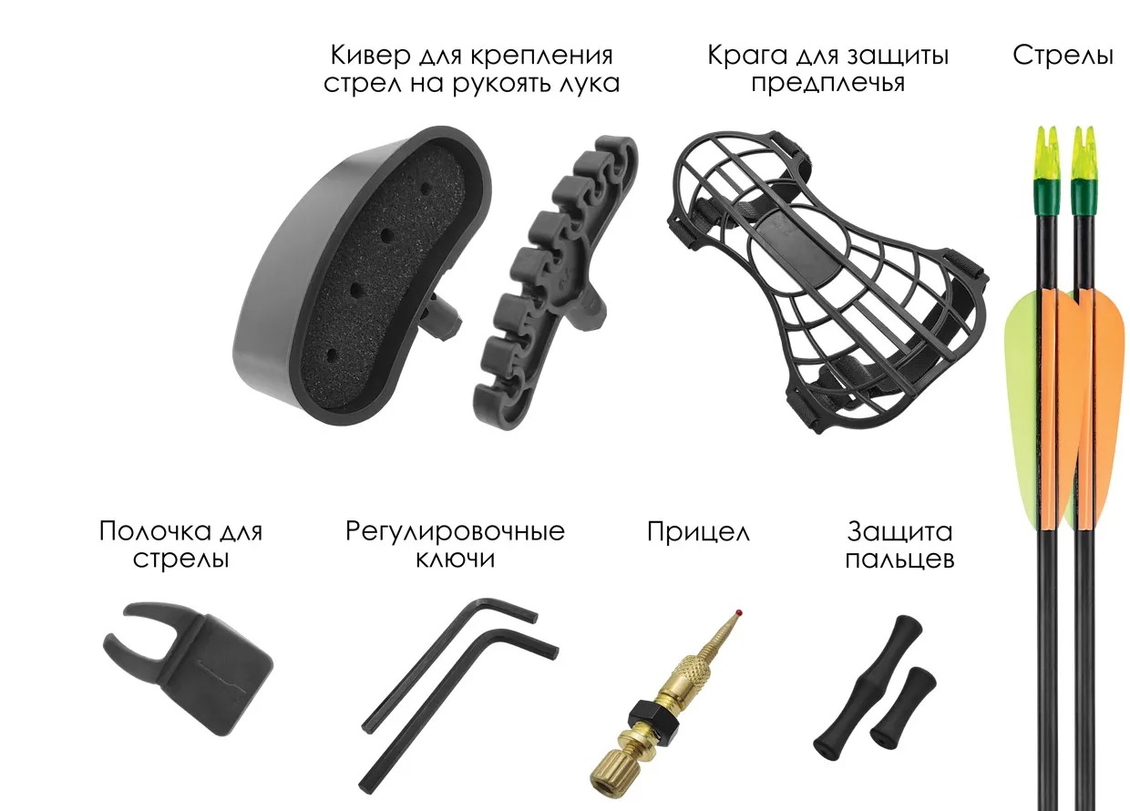 Лук комплектуется всем необходимым для начала стрельбы: крага (для защиты предплечья от соприкосновения с тетивой в момент выстрела), полочка и прицел. Как дополнительная опция – к луку прилагается так называемый «кивер». Он выполняет функцию колчана, который крепится к рукоятке лука и позволяет носить стрелы прямо на луке!